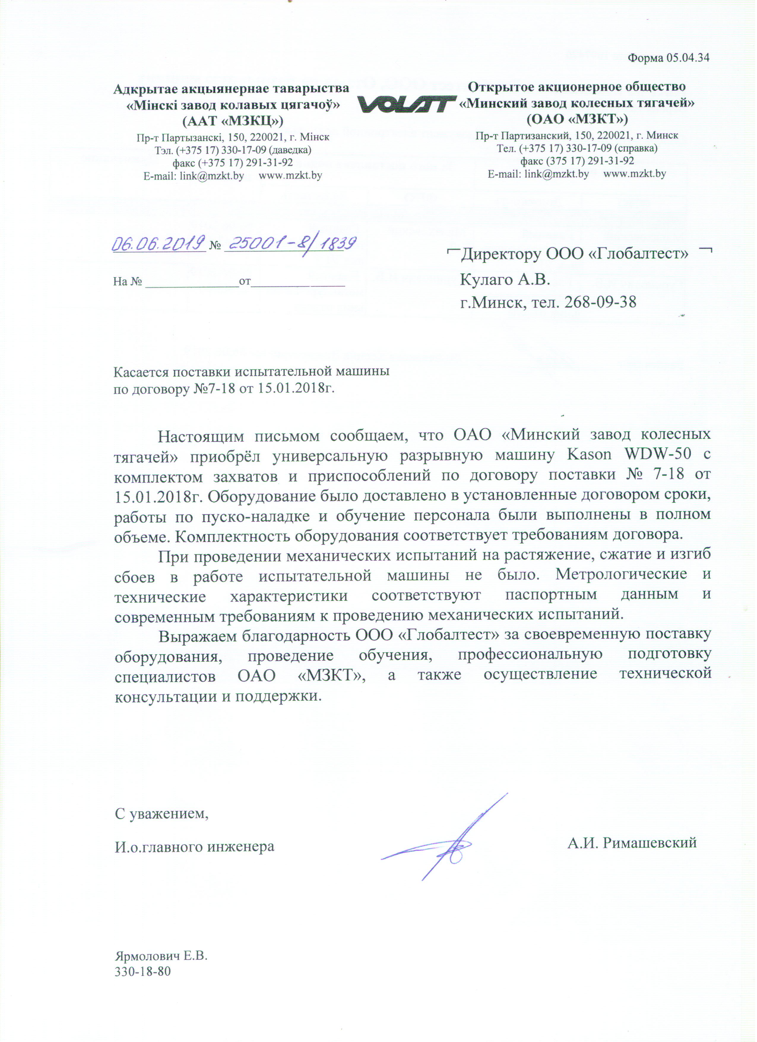 Выражаем благодарность ООО "Глобалтест" за своевременную поставку оборудования, проведение обучения, профессиональную подготовку специалистов ОАО "МЗКТ" а также осуществление технической консультации и поддержки