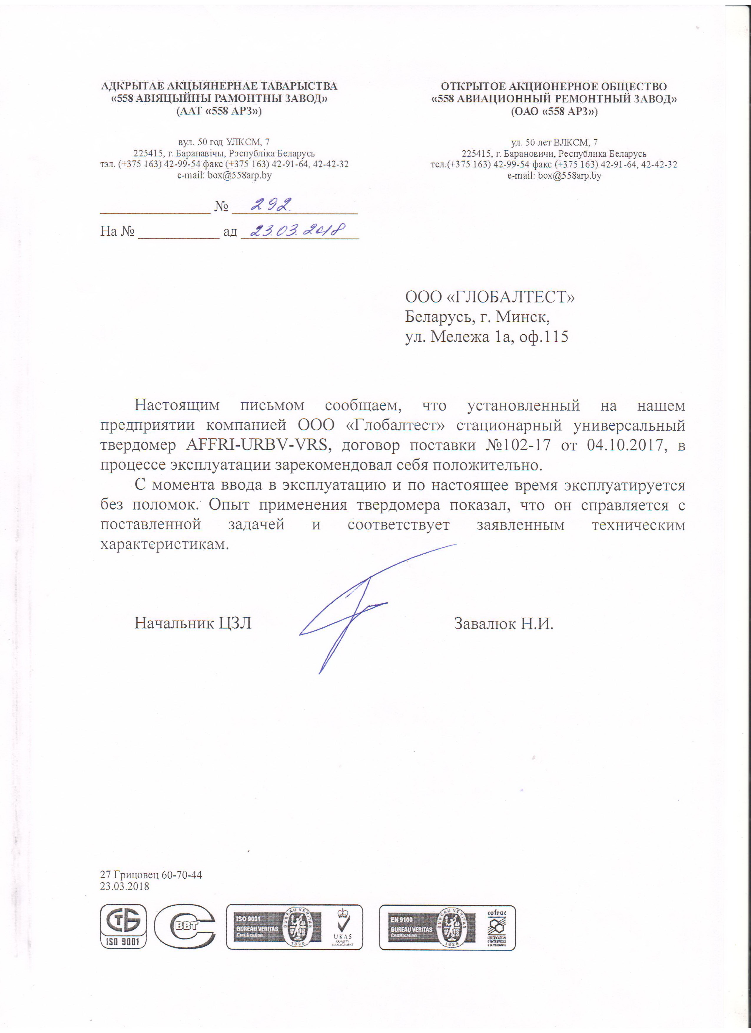Установленный на нашем предприятии компанией ООО "Глобалтест" стационарный универсальный твердомер AFFRI-URBV-VRS, договор поставки №102-17 от 04.10.2017, в процессе эксплуатации зарекомендовал себя положительно.
